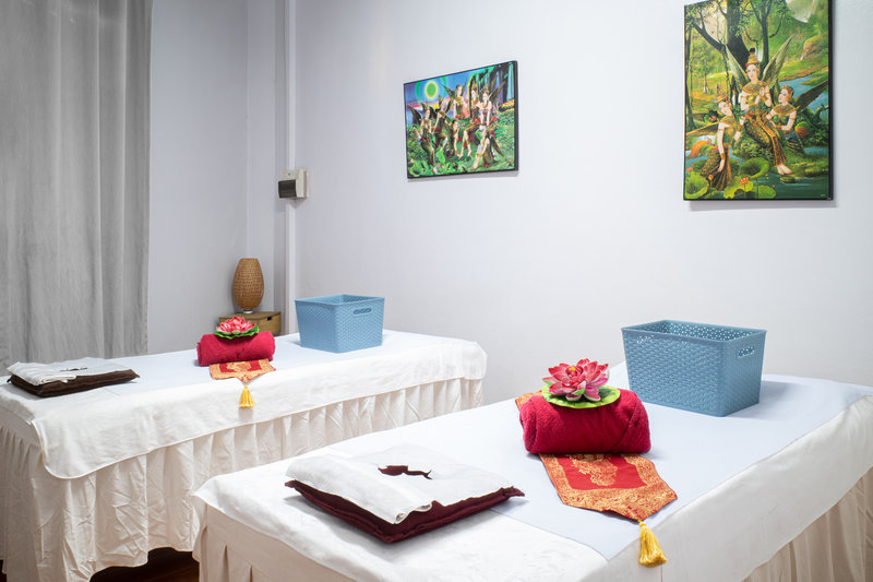 Thai massage is a combination of acupressure and yoga-like stretching techniques that employs the use of the therapist's fingers, thumbs, elbows, arms and feet on the body's muscles, pressure points and energy lines ("Sen") to clear energy blockages and balance the body's energy.